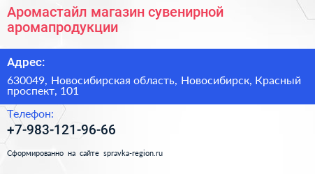 Аромастайл, магазин сувенирной аромапродукции по адресу 630049, Новосибирская область, Новосибирск, Красный проспект, 101 в дальнейшем Организация, размещена в следующих категориях: