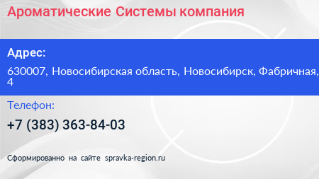 Ароматические Системы, компания по адресу 630007, Новосибирская область, Новосибирск, Фабричная, 4 в дальнейшем Организация, размещена в следующих категориях: