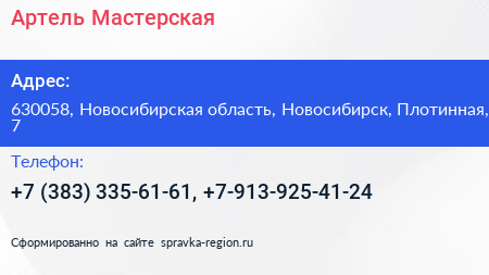 Артель Мастерская по адресу 630058, Новосибирская область, Новосибирск, Плотинная, 7 в дальнейшем Организация, размещена в следующих категориях: