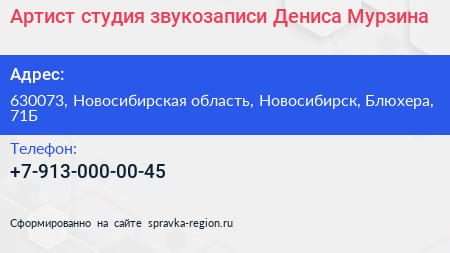 Артист, студия звукозаписи Дениса Мурзина по адресу 630073, Новосибирская область, Новосибирск, Блюхера, 71Б в дальнейшем Организация, размещена в следующих категориях: