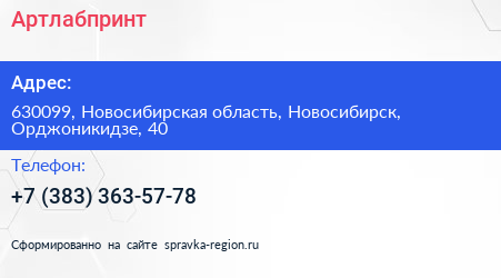 Артлабпринт по адресу 630099, Новосибирская область, Новосибирск, Орджоникидзе, 40 в дальнейшем Организация, размещена в следующих категориях: