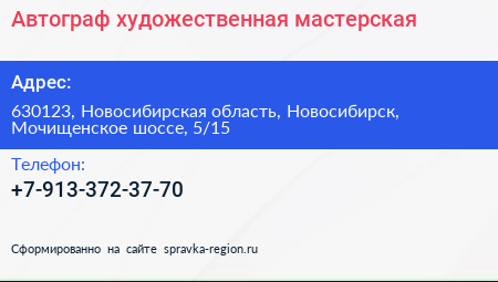 Автограф, художественная мастерская по адресу 630123, Новосибирская область, Новосибирск, Мочищенское шоссе, 5/15 в дальнейшем Организация, размещена в следующих категориях: