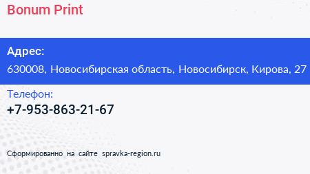 Bonum Print по адресу 630008, Новосибирская область, Новосибирск, Кирова, 27 в дальнейшем Организация, размещена в следующих категориях: