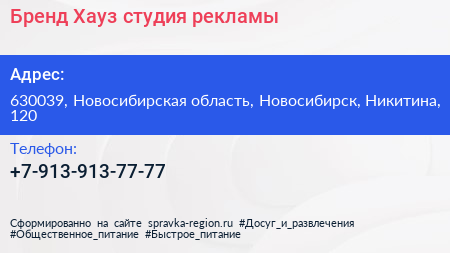 Бренд Хауз, студия рекламы по адресу 630039, Новосибирская область, Новосибирск, Никитина, 120 в дальнейшем Организация, размещена в следующих категориях:
