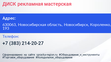 ДИСК, рекламная мастерская по адресу 630063, Новосибирская область, Новосибирск, Короленко, 193 в дальнейшем Организация, размещена в следующих категориях: