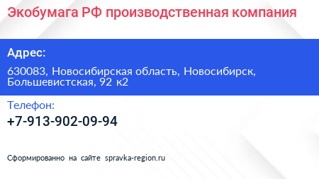 Экобумага.РФ, производственная компания по адресу 630083, Новосибирская область, Новосибирск, Большевистская, 92 к2 в дальнейшем Организация, размещена в следующих категориях: