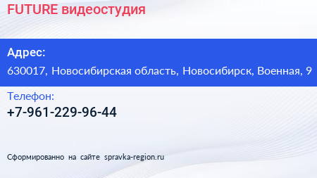 FUTURE, видеостудия по адресу 630017, Новосибирская область, Новосибирск, Военная, 9 в дальнейшем Организация, размещена в следующих категориях: