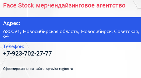Face & Stock, мерчендайзинговое агентство по адресу 630091, Новосибирская область, Новосибирск, Советская, 64 в дальнейшем Организация, размещена в следующих категориях: