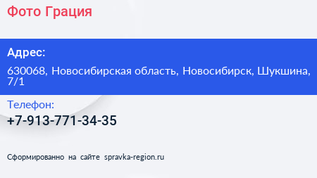 Фото-Грация по адресу 630068, Новосибирская область, Новосибирск, Шукшина, 7/1 в дальнейшем Организация, размещена в следующих категориях:
