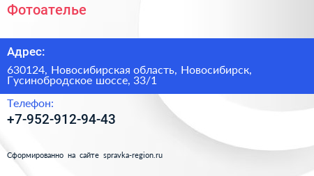 Фотоателье по адресу 630124, Новосибирская область, Новосибирск, Гусинобродское шоссе, 33/1 в дальнейшем Организация, размещена в следующих категориях: