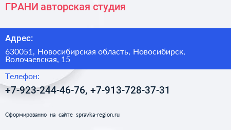 ГРАНИ, авторская студия по адресу 630051, Новосибирская область, Новосибирск, Волочаевская, 15 в дальнейшем Организация, размещена в следующих категориях: