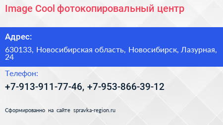 Image Cool, фотокопировальный центр по адресу 630133, Новосибирская область, Новосибирск, Лазурная, 24 в дальнейшем Организация, размещена в следующих категориях: