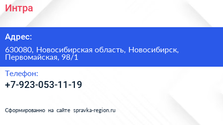 Интра по адресу 630080, Новосибирская область, Новосибирск, Первомайская, 98/1 в дальнейшем Организация, размещена в следующих категориях: