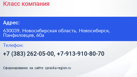 Класс, компания по адресу 630039, Новосибирская область, Новосибирск, Панфиловцев, 60а в дальнейшем Организация, размещена в следующих категориях: