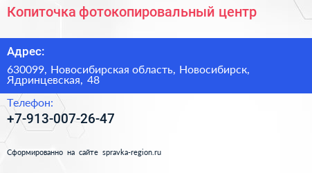 Копиточка, фотокопировальный центр по адресу 630099, Новосибирская область, Новосибирск, Ядринцевская, 48 в дальнейшем Организация, размещена в следующих категориях: