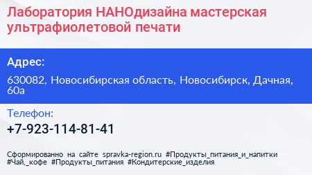 Лаборатория НАНОдизайна, мастерская ультрафиолетовой печати по адресу 630082, Новосибирская область, Новосибирск, Дачная, 60а в дальнейшем Организация, размещена в следующих категориях: