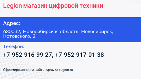 Legion, магазин цифровой техники по адресу 630032, Новосибирская область, Новосибирск, Котовского, 2 в дальнейшем Организация, размещена в следующих категориях: