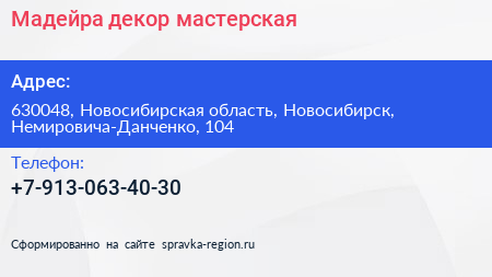 Мадейра декор, мастерская по адресу 630048, Новосибирская область, Новосибирск, Немировича-Данченко, 104 в дальнейшем Организация, размещена в следующих категориях: