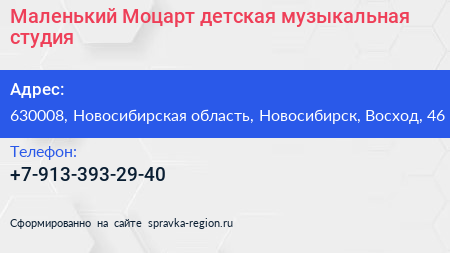 Маленький Моцарт, детская музыкальная студия по адресу 630008, Новосибирская область, Новосибирск, Восход, 46 в дальнейшем Организация, размещена в следующих категориях: