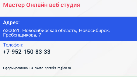 Мастер.Онлайн, веб-студия по адресу 630061, Новосибирская область, Новосибирск, Гребенщикова, 7 в дальнейшем Организация, размещена в следующих категориях: