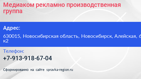 Медиаком, рекламно-производственная группа по адресу 630015, Новосибирская область, Новосибирск, Алейская, 6 к2 в дальнейшем Организация, размещена в следующих категориях: