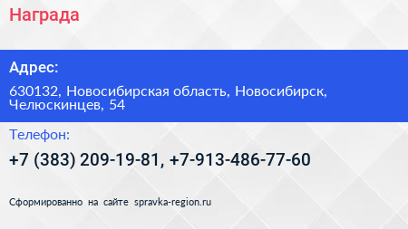 Награда по адресу 630132, Новосибирская область, Новосибирск, Челюскинцев, 54 в дальнейшем Организация, размещена в следующих категориях: