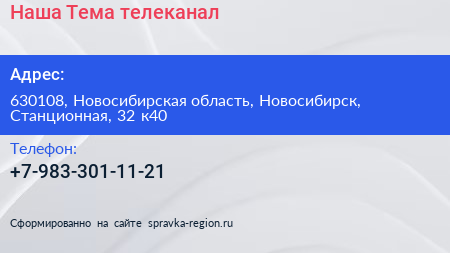 Наша Тема, телеканал по адресу 630108, Новосибирская область, Новосибирск, Станционная, 32 к40 в дальнейшем Организация, размещена в следующих категориях: