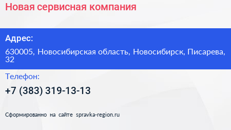 Новая сервисная компания по адресу 630005, Новосибирская область, Новосибирск, Писарева, 32 в дальнейшем Организация, размещена в следующих категориях: