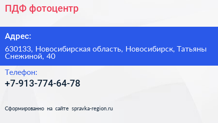 ПДФ, фотоцентр по адресу 630133, Новосибирская область, Новосибирск, Татьяны Снежиной, 40 в дальнейшем Организация, размещена в следующих категориях: