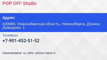 POP OFF Studio по адресу 630084, Новосибирская область, Новосибирск, Дениса Давыдова, 1 в дальнейшем Организация, размещена в следующих категориях: