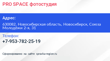 PRO SPACE, фотостудия по адресу 630082, Новосибирская область, Новосибирск, Союза Молодёжи 2-я, 31 в дальнейшем Организация, размещена в следующих категориях: