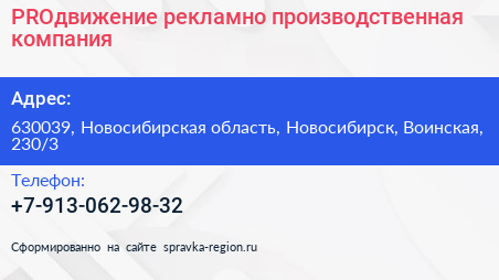 PROдвижение, рекламно-производственная компания по адресу 630039, Новосибирская область, Новосибирск, Воинская, 230/3 в дальнейшем Организация, размещена в следующих категориях: