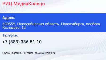 РИЦ МедиаКольцо по адресу 630559, Новосибирская область, Новосибирск, посёлок Кольцово, 12 в дальнейшем Организация, размещена в следующих категориях: