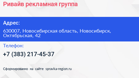 Ривайв, рекламная группа по адресу 630007, Новосибирская область, Новосибирск, Октябрьская, 42 в дальнейшем Организация, размещена в следующих категориях:
