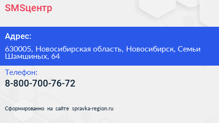 SMSцентр по адресу 630005, Новосибирская область, Новосибирск, Семьи Шамшиных, 64 в дальнейшем Организация, размещена в следующих категориях: