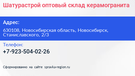 Шатурастрой, оптовый склад керамогранита по адресу 630108, Новосибирская область, Новосибирск, Станиславского, 2/3 в дальнейшем Организация, размещена в следующих категориях: