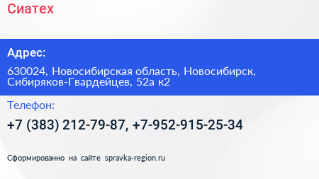 Сиатех по адресу 630024, Новосибирская область, Новосибирск, Сибиряков-Гвардейцев, 52а к2 в дальнейшем Организация, размещена в следующих категориях:
