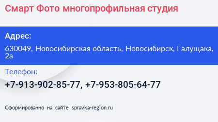 Смарт Фото, многопрофильная студия по адресу 630049, Новосибирская область, Новосибирск, Галущака, 2а в дальнейшем Организация, размещена в следующих категориях: