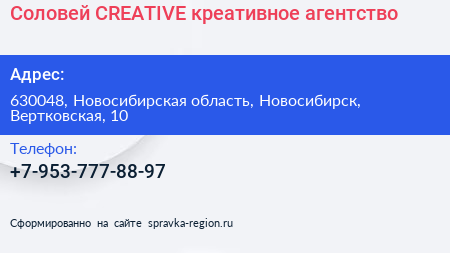 Соловей CREATIVE, креативное агентство по адресу 630048, Новосибирская область, Новосибирск, Вертковская, 10 в дальнейшем Организация, размещена в следующих категориях: