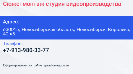 Сюжетмонтаж, студия видеопроизводства по адресу 630015, Новосибирская область, Новосибирск, Королёва, 40 к5 в дальнейшем Организация, размещена в следующих категориях: