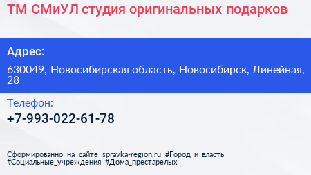 ТМ СМиУЛ, студия оригинальных подарков по адресу 630049, Новосибирская область, Новосибирск, Линейная, 28 в дальнейшем Организация, размещена в следующих категориях: