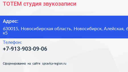 ТОТЕМ, студия звукозаписи по адресу 630015, Новосибирская область, Новосибирск, Алейская, 6 к5 в дальнейшем Организация, размещена в следующих категориях: