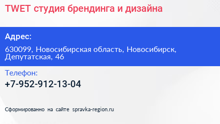 TWET, студия брендинга и дизайна по адресу 630099, Новосибирская область, Новосибирск, Депутатская, 46 в дальнейшем Организация, размещена в следующих категориях:
