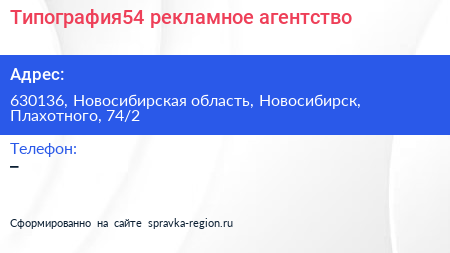 Типография54, рекламное агентство по адресу 630136, Новосибирская область, Новосибирск, Плахотного, 74/2 в дальнейшем Организация, размещена в следующих категориях: