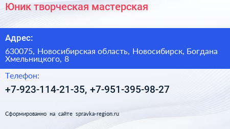 Юник, творческая мастерская по адресу 630075, Новосибирская область, Новосибирск, Богдана Хмельницкого, 8 в дальнейшем Организация, размещена в следующих категориях: