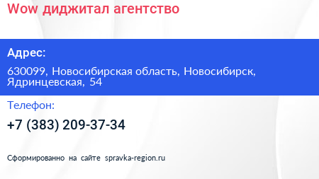 Wow, диджитал-агентство по адресу 630099, Новосибирская область, Новосибирск, Ядринцевская, 54 в дальнейшем Организация, размещена в следующих категориях: