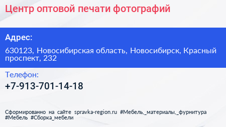 Центр оптовой печати фотографий по адресу 630123, Новосибирская область, Новосибирск, Красный проспект, 232 в дальнейшем Организация, размещена в следующих категориях: