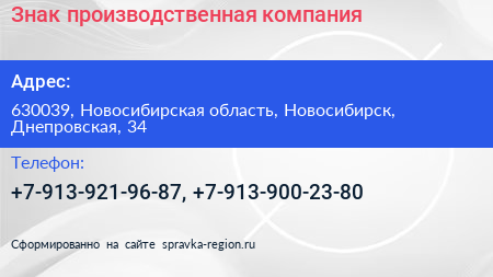 Знак, производственная компания по адресу 630039, Новосибирская область, Новосибирск, Днепровская, 34 в дальнейшем Организация, размещена в следующих категориях: