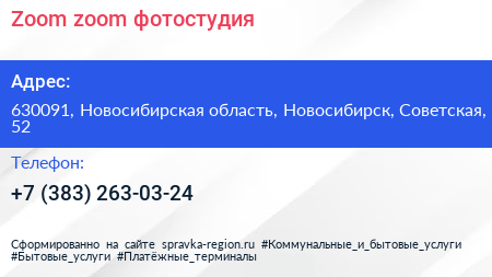 Zoom-zoom, фотостудия по адресу 630091, Новосибирская область, Новосибирск, Советская, 52 в дальнейшем Организация, размещена в следующих категориях: