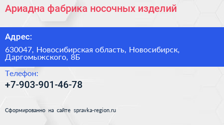 Ариадна, фабрика носочных изделий по адресу 630047, Новосибирская область, Новосибирск, Даргомыжского, 8Б в дальнейшем Организация, размещена в следующих категориях: